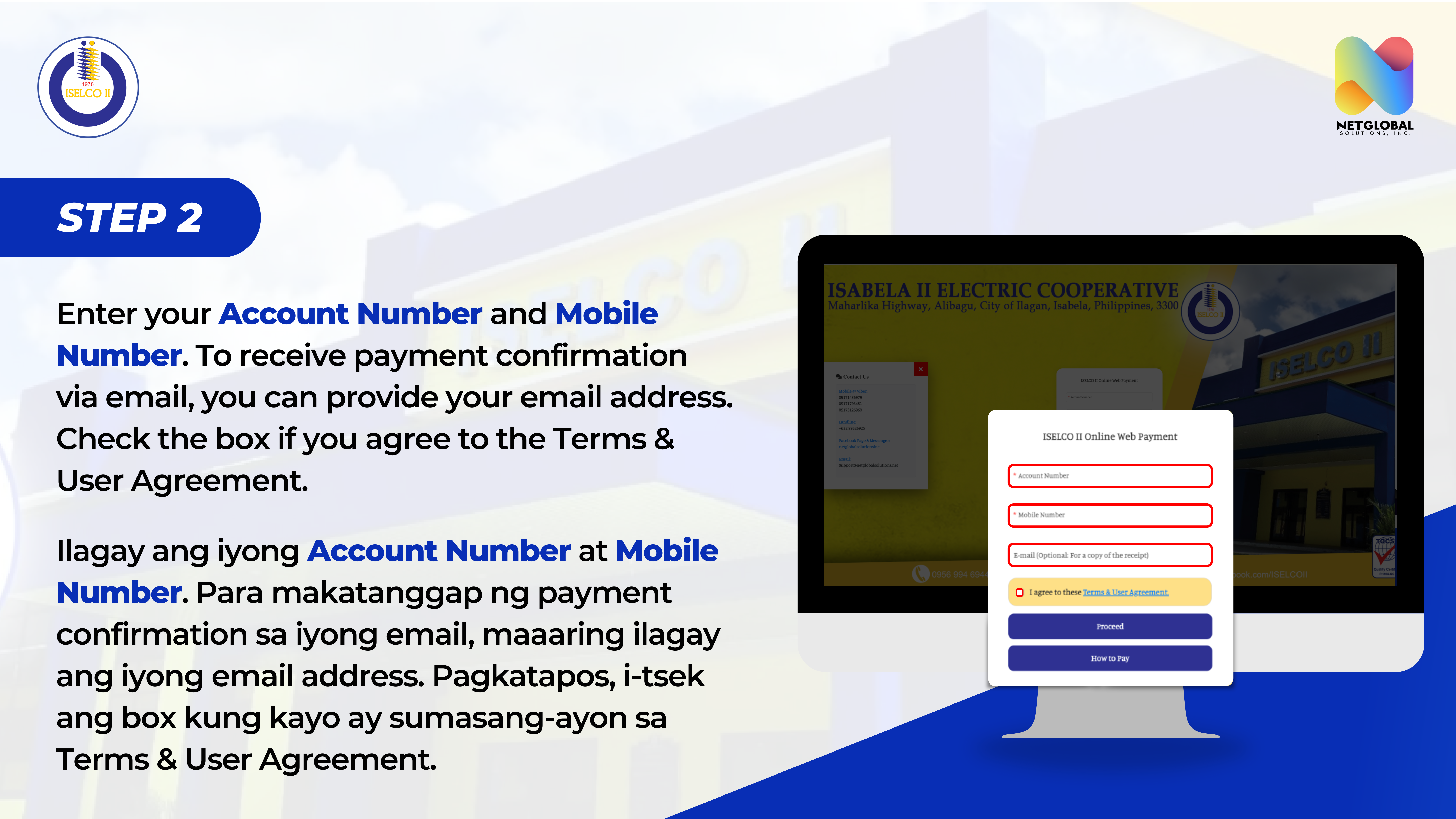 Pakisuri kung tama ang iyong Account number ayon sa iyong billing. Maaaring hindi ito available dahil hindi pa available ang iyong kasalukuyang reading. Ang reading period ng ISELCO II ay mula ika-20 hanggang ika-26 ng buwan. Kung nananatiling hindi wasto pagkatapos suriin, maaari mong tawagan ang aming mga customer service representative upang ipaalam ang sitwasyong ito.